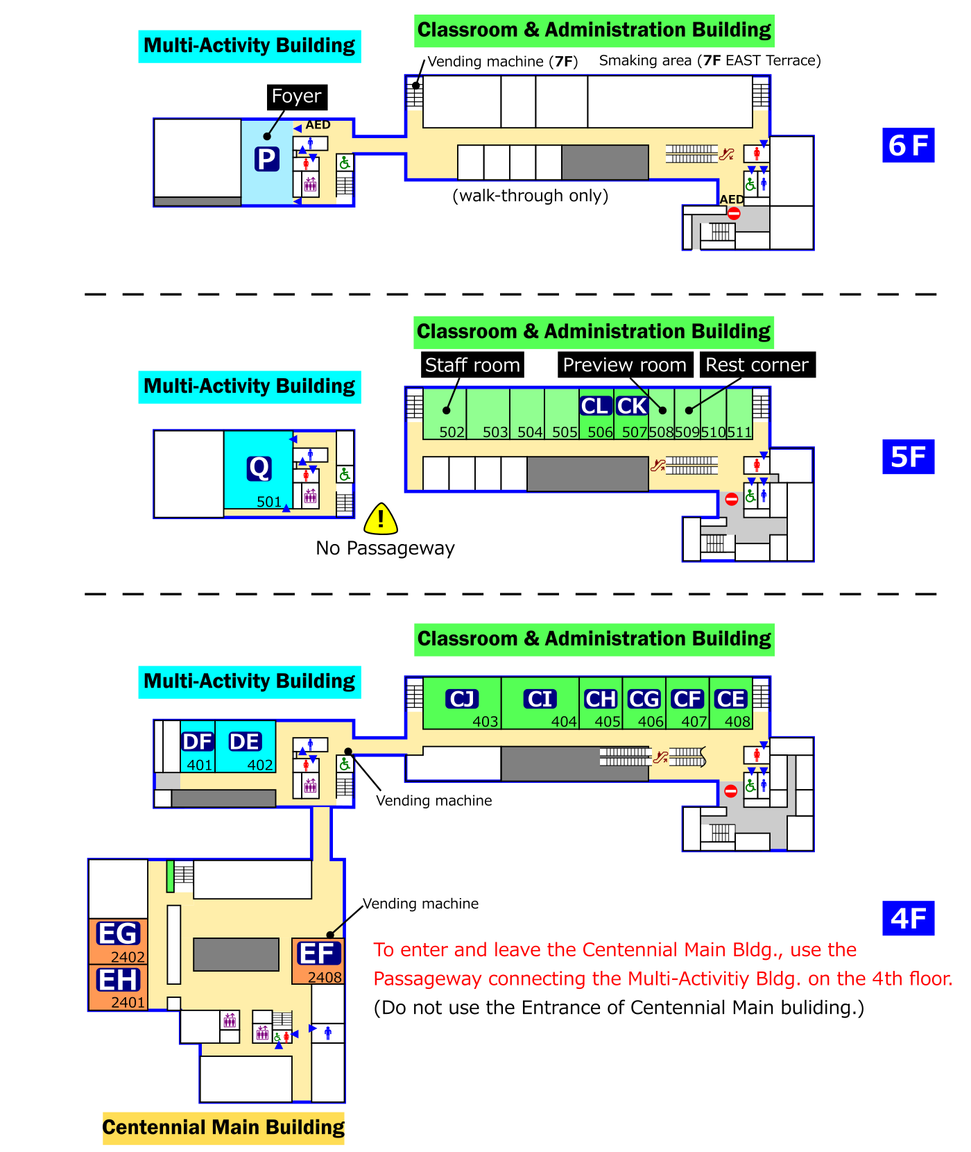 | Floor | Centennial Main Bldg. | Multi-Activity Bldg. | Classroom and Administration Bldg. | ||