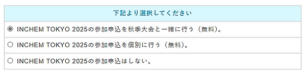 また、参加登録フォーム中にINCHEM TOKYO 2025の参加申込を希望するかどうかの質問があります。希望するものを選んでください。