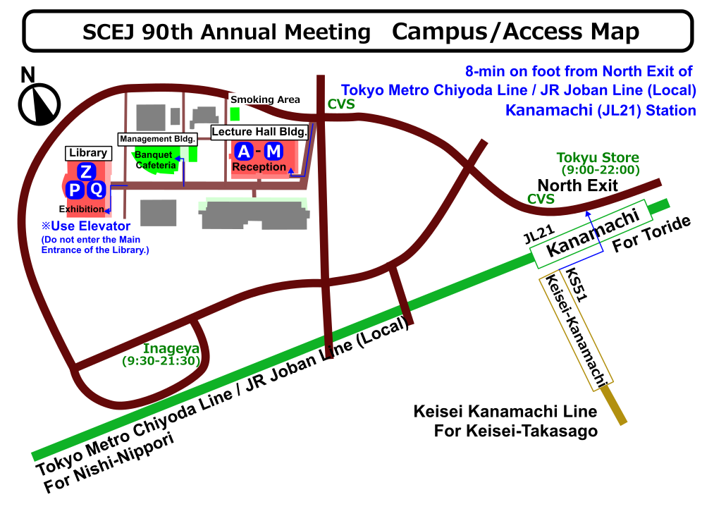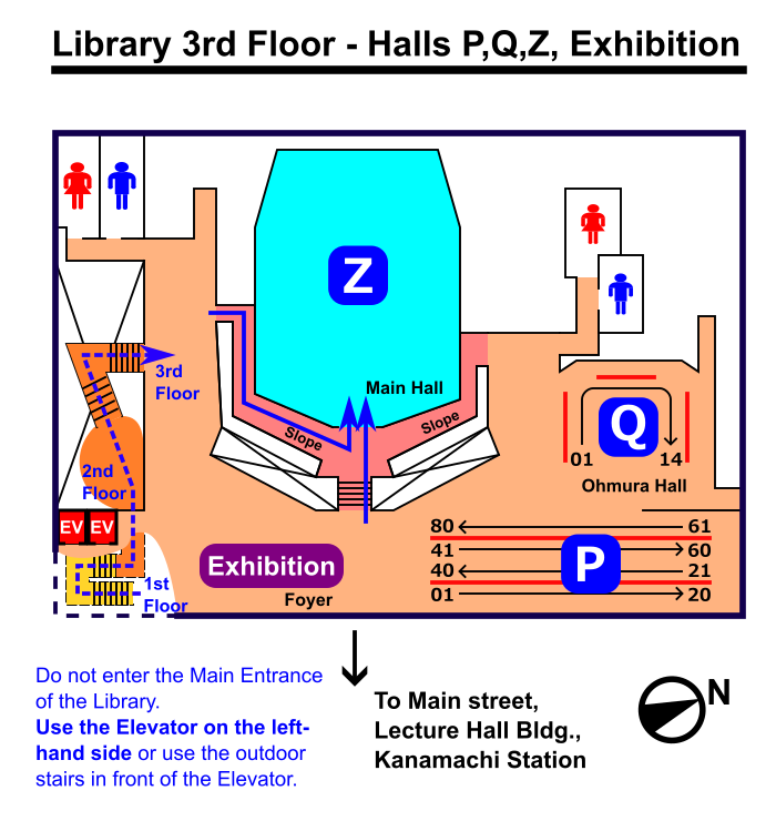 | Library (3rd Floor) | Ceremony (Hall Z), Poster session (Halls P, Q), Exhibition Do not enter the Main Entrance of the Library. Use the Elevator on the left-hand side. No food/Drink on this floor (except for Hall Q "Ohmura Hall"). The Hall Q will become Communication corner on Mar. 13 and Mar. 14. |