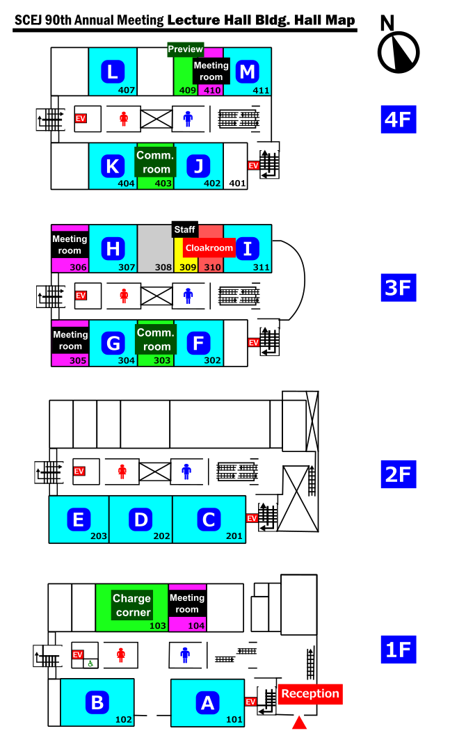 | Lecture Hall Bldg. | Reception, Cloakroom, Halls A-M Charge corner (103): AC tap is available. Please be quiet in this room. Communication room (303, 403): for communications among Speakers and Participants |